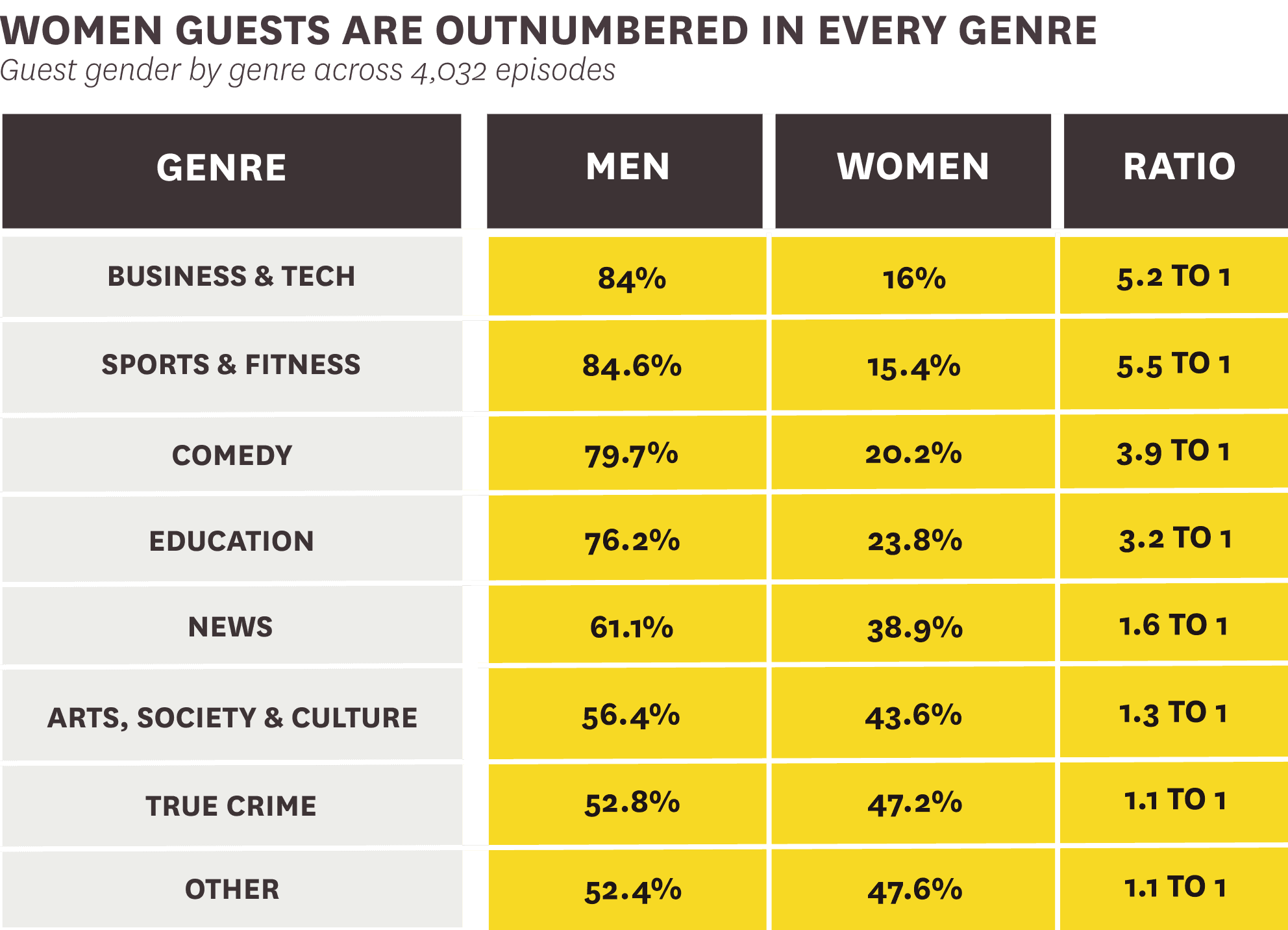 Using the same genres identified earlier, we assess the percentage of male and female guests appearing on every episode of the podcasts in each category. Female guests were outnumbered across every genre, but were most likely to appear in podcasts focused on True Crime, Arts, Society, & Culture, and those on Other topics. Female guests were least likely to appear in Sports & Fitness and Business & Technology podcast episodes.